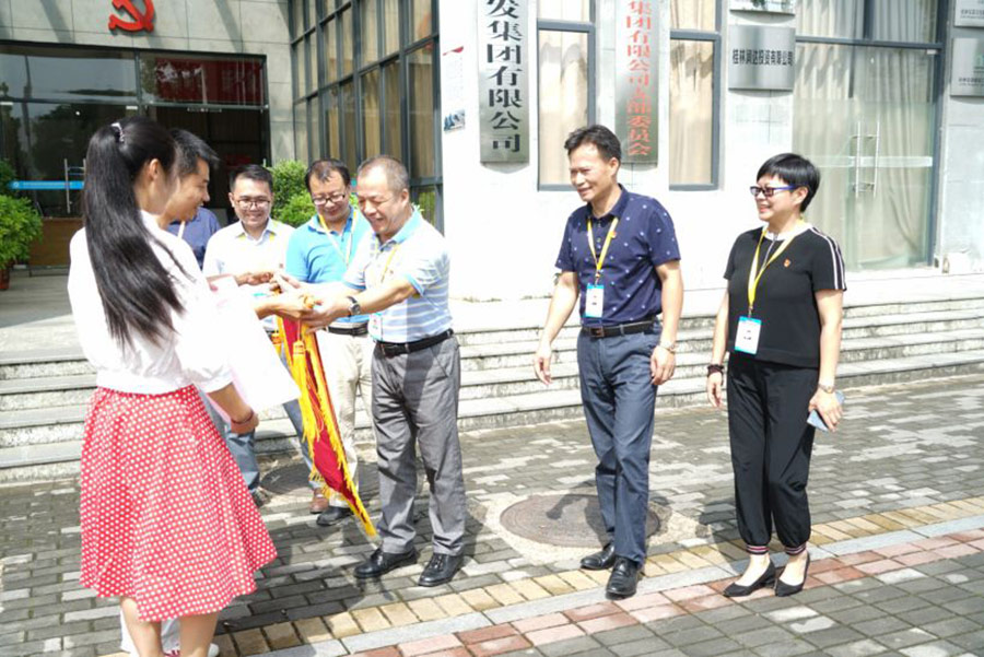 2018年9月18日上午,臨桂鎮(zhèn)花堽小學校長秦開勝、黨支部書記秦海燕將一面印有“捐資助學,無尚光榮”的錦旗送到新城投資集團。集團公司黨支部書記周道林、集團經營班子、支部委員一起接受錦旗。
