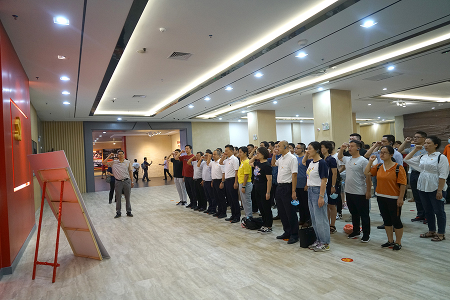 在紀(jì)念館,黨員們仔細(xì)觀(guān)看館內(nèi)所陳列的各種珍貴文物、文獻(xiàn)、照片等資料,伴隨著講解員動(dòng)情的解說(shuō),大家懷著敬仰的心情默默聆聽(tīng),重溫紅色記憶,追尋革命足跡。在趙新明的領(lǐng)誓下,全體黨員重溫入黨誓詞。