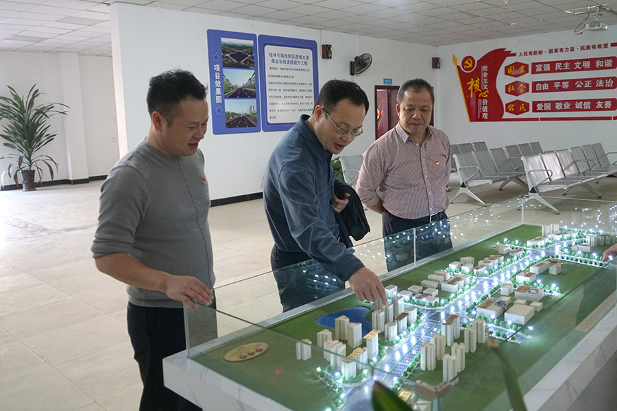 11月18日下午,臨桂新區(qū)工委委員、管委會(huì)副主任蔣玖明一行到西城大道南延長(zhǎng)線道路提升工程項(xiàng)目現(xiàn)場(chǎng)調(diào)研,指導(dǎo)西城大道南延長(zhǎng)線項(xiàng)目聯(lián)合黨支部黨建工作。臨桂新區(qū)工委組織人事部部長(zhǎng)、創(chuàng)建領(lǐng)導(dǎo)小組辦公室主任梁利,新區(qū)黨總支委員、創(chuàng)建領(lǐng)導(dǎo)小組辦公室副主任藍(lán)方,新城投資集團(tuán)黨總支書記、董事長(zhǎng)、總經(jīng)理周道林,黨總支組織委員、工會(huì)主席譚力源陪同調(diào)研。