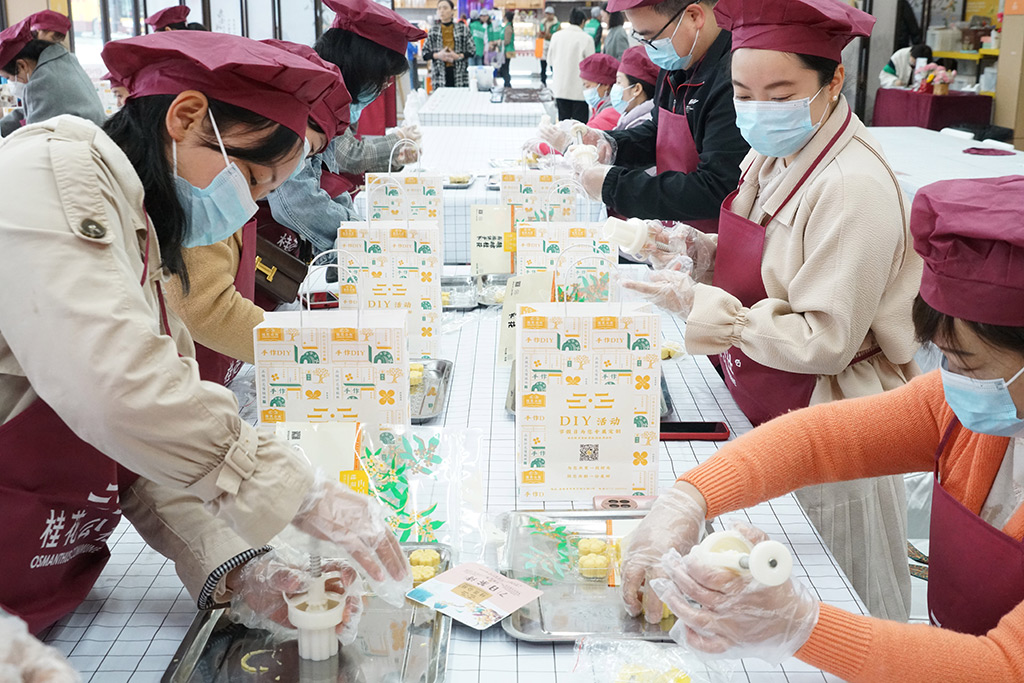第一項(xiàng)活動(dòng)是動(dòng)手制作桂花糕。桂花糕在桂林已經(jīng)有近百年的歷史,因桂花得名,體現(xiàn)桂林歷史和傳統(tǒng)文化印記。大家手拿模具,在老師的指導(dǎo)下,有模有樣地動(dòng)手制作桂花糕,制作過程中時(shí)而向身邊人討教制作技巧,時(shí)而交換模具制作出不同的樣式,歡聲笑語中一個(gè)個(gè)芳香四溢的桂花糕躍然眼前,女職工們體驗(yàn)到了勞動(dòng)帶來的快樂愉悅。