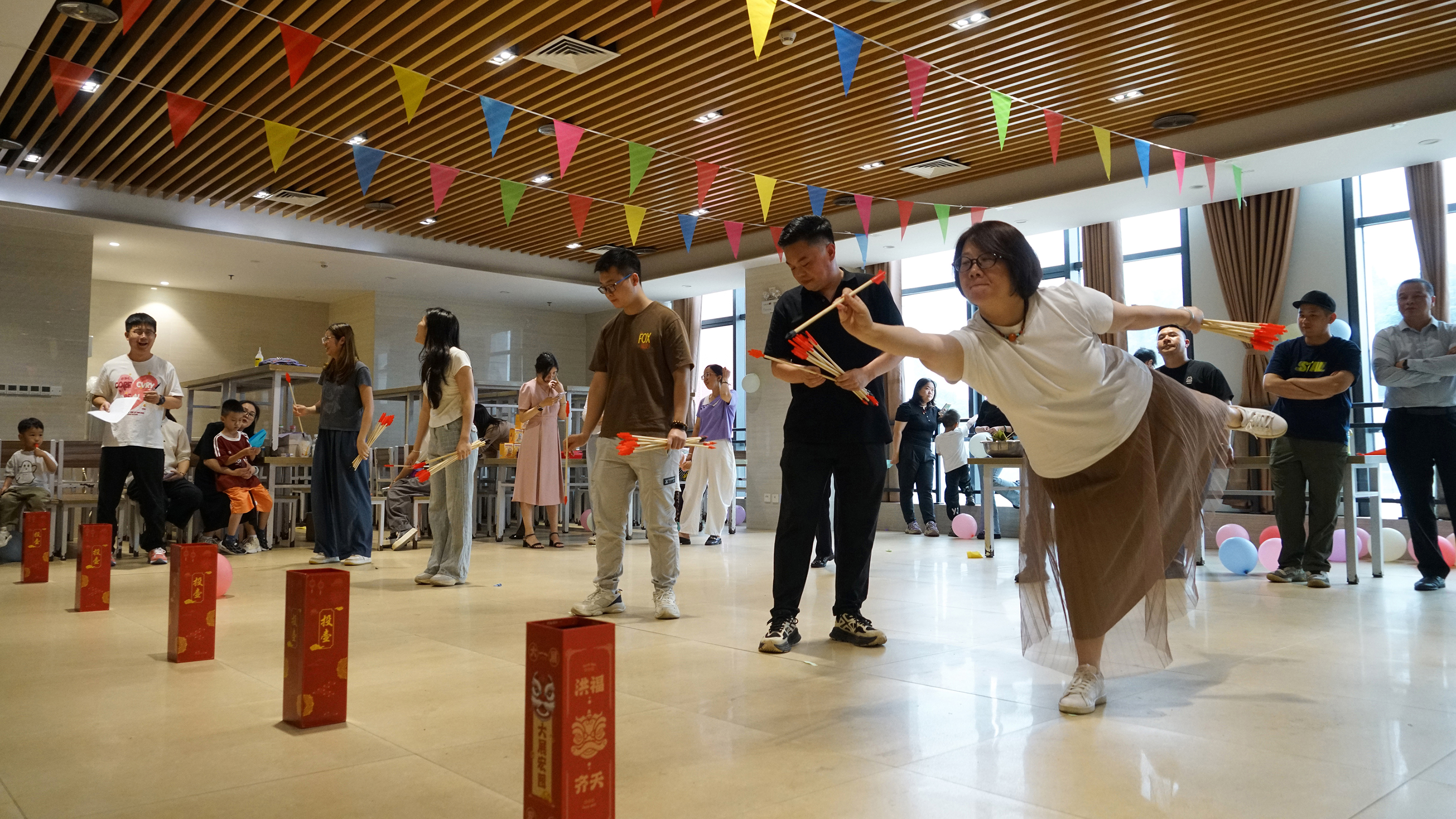 “家企同行·國風(fēng)非遺——民族文創(chuàng),與‘粽’不‘童’”趣味游戲挑戰(zhàn)環(huán)節(jié),將活動氛圍推向高潮。童年紙飛機(jī)、端午射五毒、趣味投壺三大趣味游戲讓職工與孩子都沉浸其中。在童年紙飛機(jī)游戲中,為了能讓紙飛機(jī)飛得更遠(yuǎn)、更久,大家興致勃勃地嘗試著各種折法,隨后用力一擲,紙飛機(jī)在空中劃出一道道優(yōu)美的弧線,有的飛得又高又遠(yuǎn),有的則在空中翻轉(zhuǎn)幾圈后穩(wěn)穩(wěn)落地,看著自己折的紙飛機(jī)歡呼雀躍,仿佛回到了無憂無慮的童年時(shí)光。端午射五毒游戲則充滿了傳統(tǒng)韻味,大家手持飛鏢,瞄準(zhǔn)靶心,每當(dāng)有人射中五毒圖案,周圍就會響起一陣歡呼聲,大家在歡聲笑語中感受著端午節(jié)的傳統(tǒng)習(xí)俗。趣味投壺游戲更是熱鬧非凡,參與者們瞄準(zhǔn)壺口,或站或蹲,調(diào)整著姿勢和力度,隨著一次次投中,現(xiàn)場的氣氛也一次次被點(diǎn)燃,歡呼聲、加油聲此起彼伏。歡聲笑語回蕩在整個活動現(xiàn)場。各組成員在比賽中相互配合、相互鼓勵,展現(xiàn)了團(tuán)隊(duì)合作的力量。最終,根據(jù)各組獲得的總分,評選出冠軍組,大家在歡樂中感受到了團(tuán)隊(duì)的溫暖與力量。