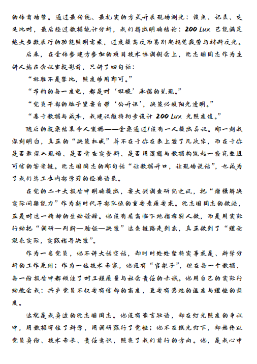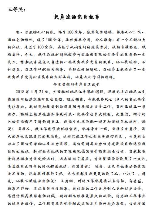 為確保比賽的專業(yè)性與公正性,集團黨委聯(lián)合第三黨支部委員及群眾代表組成評審小組,從主題性、感染力、文字表達、創(chuàng)新性四個維度對作品進行綜合評分。經(jīng)過層層篩選,最終評選出一等獎2名、二等獎1名、三等獎3名、優(yōu)秀獎5名。獲獎作品既有對黨員先進事跡的深度刻畫,也有對黨性精神的深刻詮釋,充分反映了參賽者的真情實感與創(chuàng)作水平。