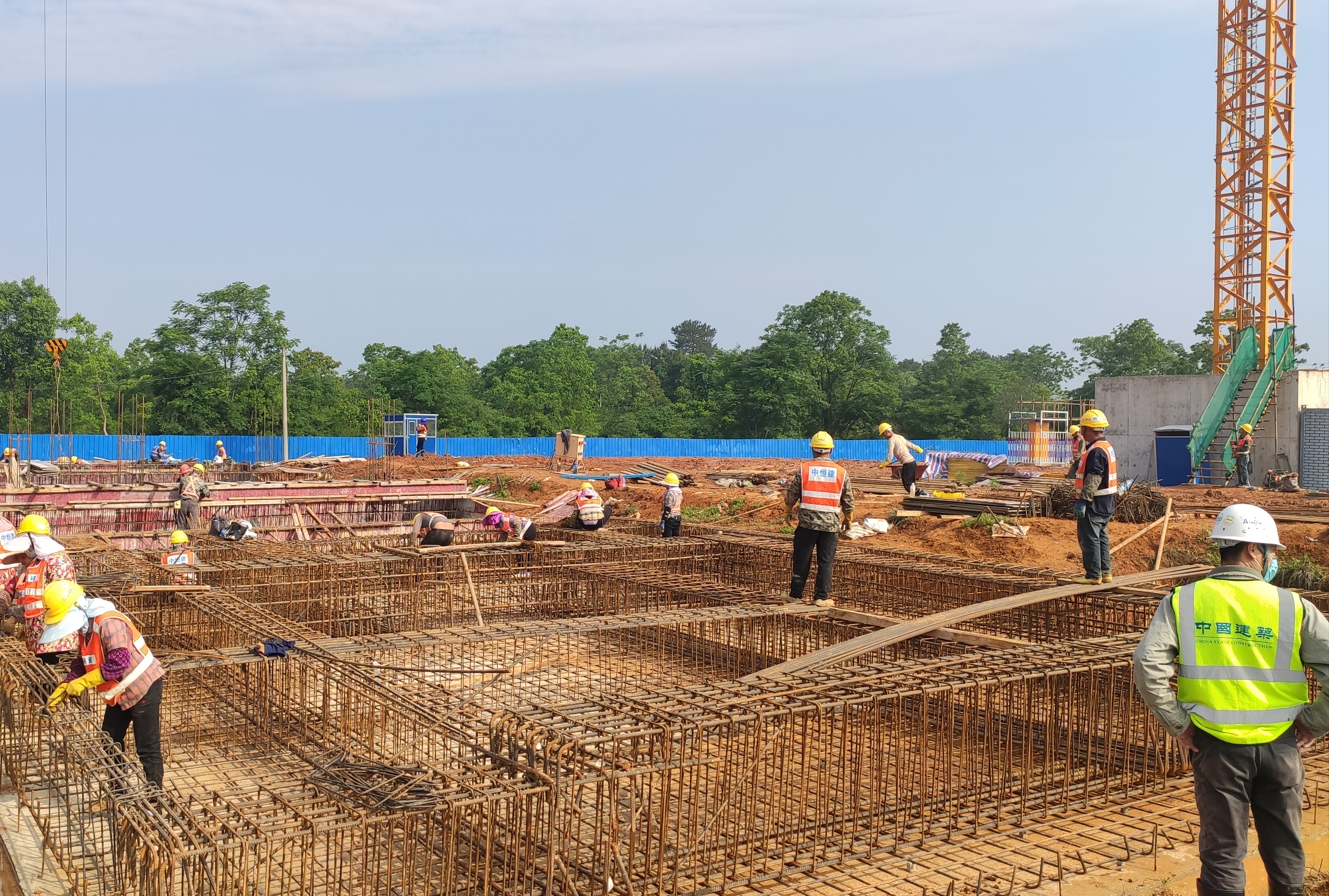 桂林學(xué)院7棟學(xué)生宿舍項目時間緊任務(wù)重,項目要在開學(xué)前交付使用,建設(shè)期間又逢“桂林的端午雨季”,為更好地發(fā)揮黨組織在項目上的促進作用,集團黨總支與項目參建單位共同組建了臨時聯(lián)合黨支部,以黨建為引領(lǐng),做到“項目建在哪里,黨旗就飄揚在哪里,黨組織戰(zhàn)斗堡壘作用就發(fā)揮到哪里”,黨支部戰(zhàn)斗堡壘和黨員先鋒模范作用得到充分發(fā)揮。2022年4月項目全方位施工,“5.1”假期現(xiàn)場作業(yè)“不打烊”,現(xiàn)場施工人員每日兩班日夜兼程施工,工程全面推進,確保按時按質(zhì)按量完成各施工節(jié)點建設(shè)任務(wù)。目前,基礎(chǔ)工程已完成80%,基礎(chǔ)土方回填工程量大,受雨季天氣影響較大,事關(guān)上部結(jié)構(gòu)施工節(jié)點,項目團隊緊跟基礎(chǔ)工程的腳步開始土方回填工作,嚴(yán)保工期。