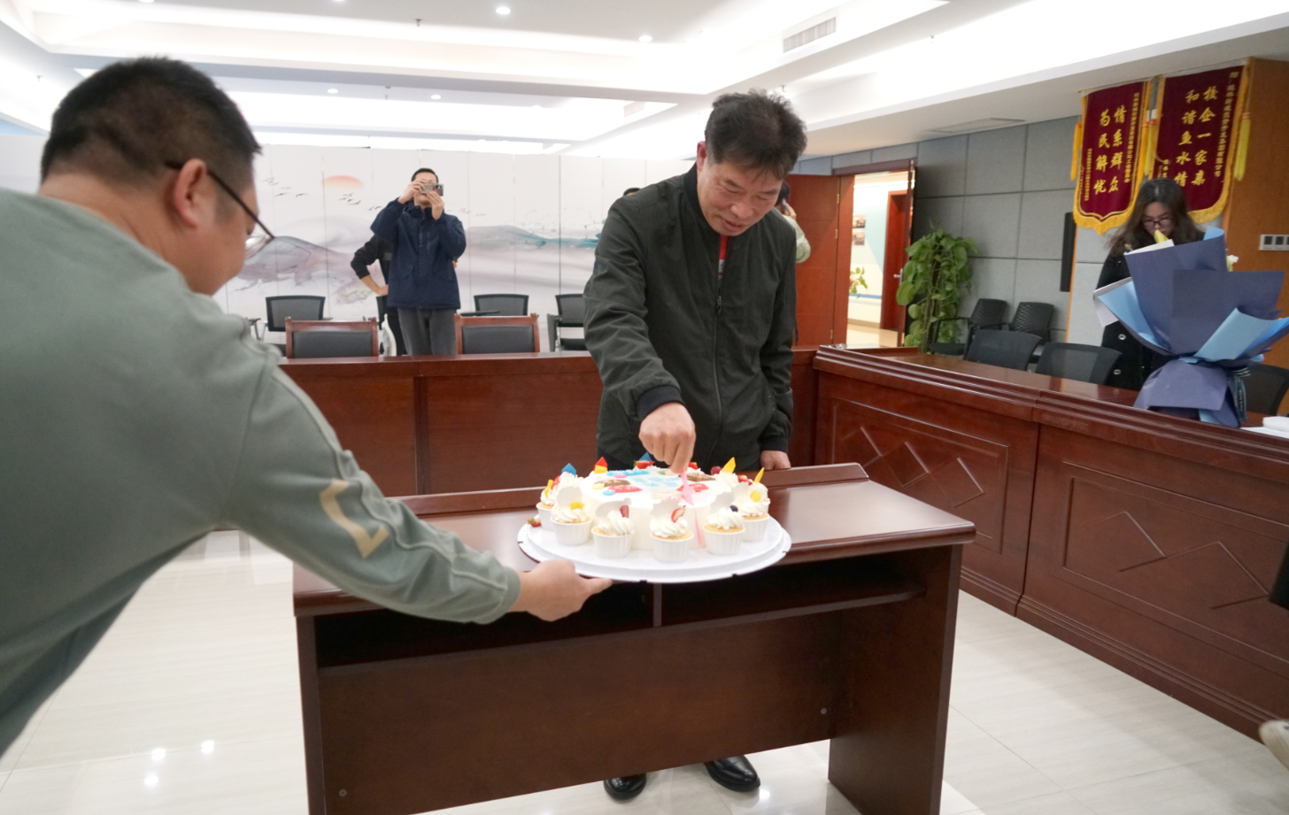隨后,集團(tuán)公司領(lǐng)導(dǎo)向陶益方同志贈(zèng)送退休禮物、相冊(cè)及鮮花,切蛋糕并合影留念。