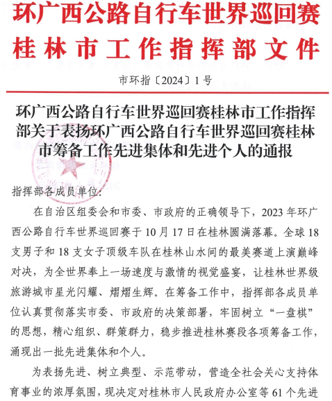 近日,根據(jù)《環(huán)廣西公路自行車世界巡回賽桂林市工作指揮部關(guān)于表揚(yáng)環(huán)廣西公路自行車世界巡回賽桂林市籌備工作先進(jìn)集體和先進(jìn)個(gè)人的通報(bào)》(市環(huán)指[2024]1號(hào))獲悉,新城投集團(tuán)下屬宏謀物業(yè)公司李楓彥同志獲環(huán)廣西公路自行車世界巡回賽桂林市籌備工作先進(jìn)個(gè)人。
