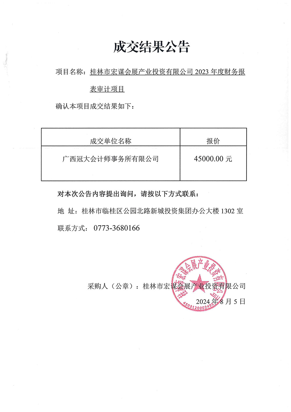 桂林市宏謀會展產(chǎn)業(yè)投資有限公司?2023年度財務(wù)報表審計項目成交結(jié)果公告