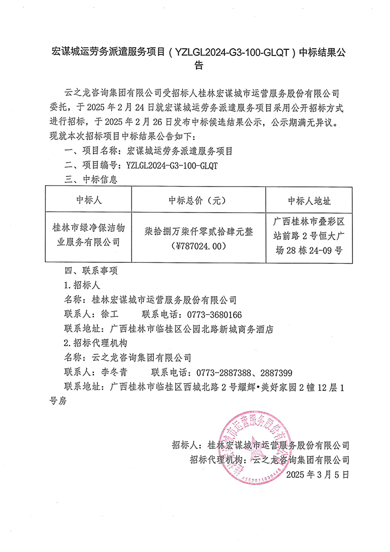 宏謀城運勞務派遣服務項目(YZLGL2024-G3-100-GLQT)中標結(jié)果公告