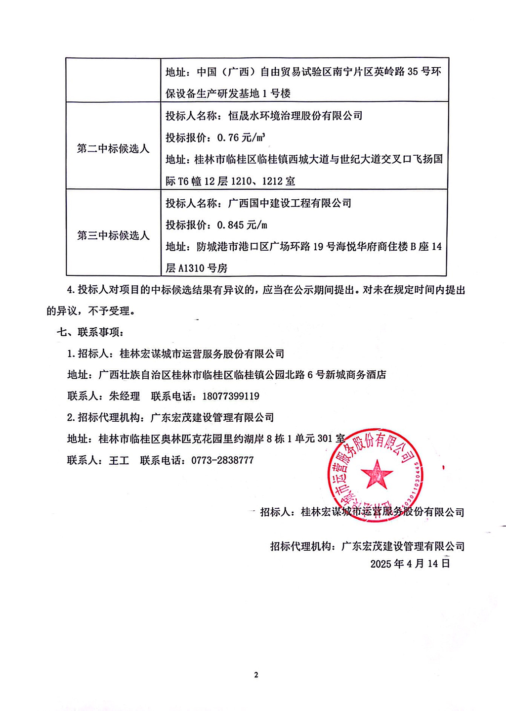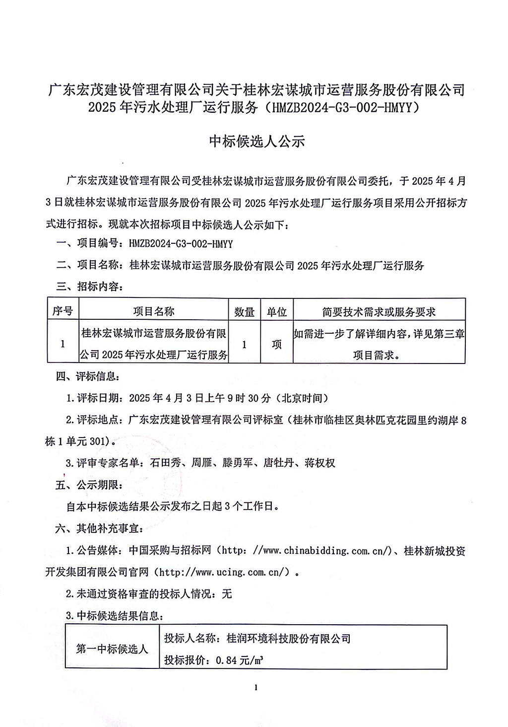 廣東宏茂建設(shè)管理有限公司關(guān)于桂林宏謀城市運(yùn)營服務(wù)股份有限公司2025年污水處理廠運(yùn)行服務(wù)(HMZB2024-G3-002-HMYY)中標(biāo)候選人公示