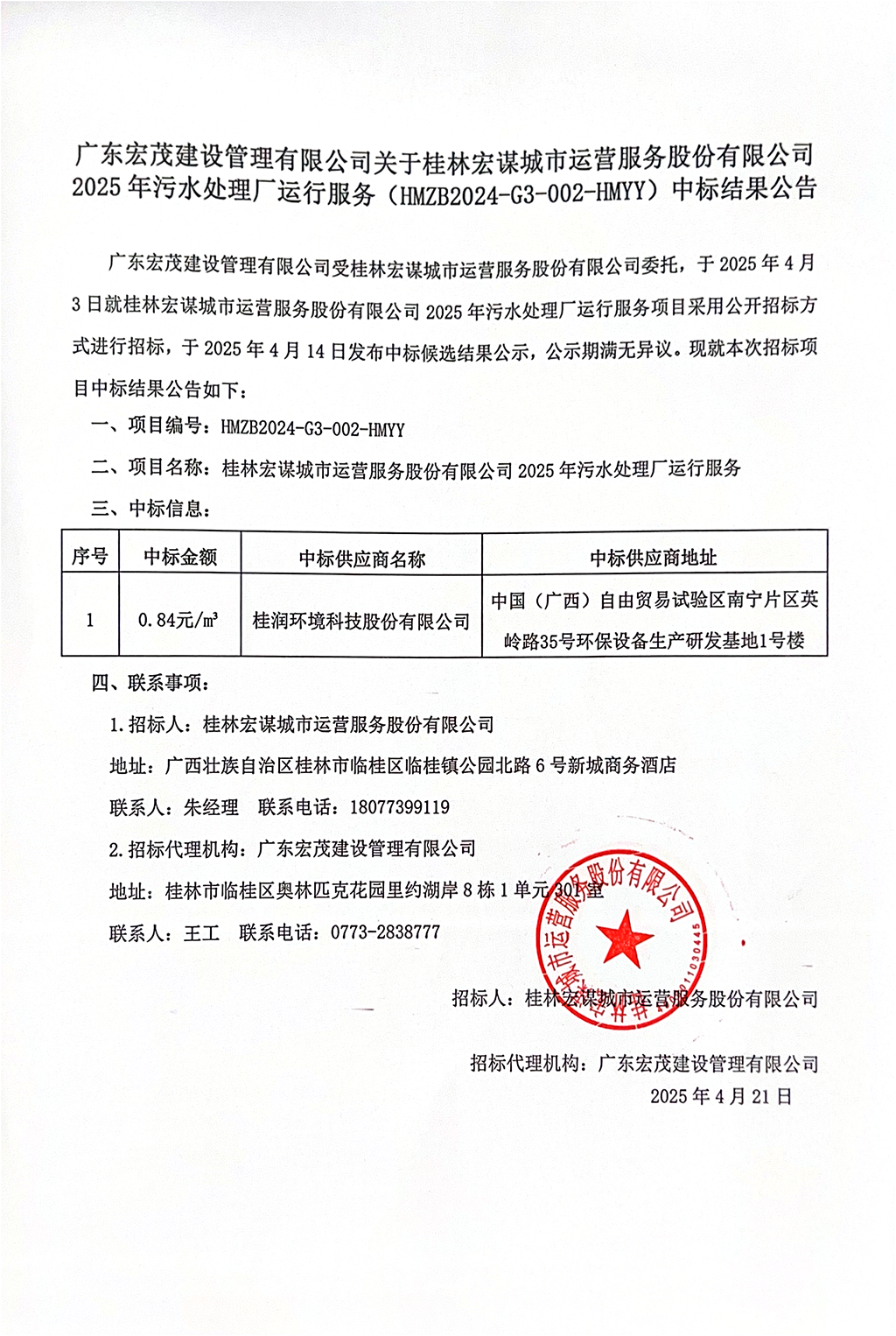 廣東宏茂建設(shè)管理有限公司關(guān)于桂林宏謀城市運(yùn)營服務(wù)股份有限公司2025年污水處理廠運(yùn)行服務(wù)(HMZB2024-G3-002-HMY)中標(biāo)結(jié)果公告