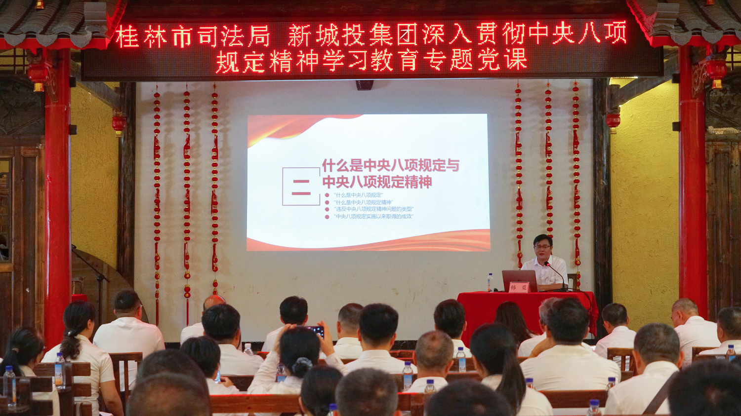 隨后,韓覓同志為全體人員講授了一堂專(zhuān)題黨課。以“深學(xué)篤行習(xí)近平總書(shū)記關(guān)于加強(qiáng)黨的作風(fēng)建設(shè)的重要論述 持續(xù)擦亮中央八項(xiàng)規(guī)定‘金色名片’以作風(fēng)建設(shè)新成效推動(dòng)司法行政工作和國(guó)有企業(yè)內(nèi)控高質(zhì)量發(fā)展”為題,圍繞“為什么要強(qiáng)調(diào)作風(fēng)建設(shè),什么是中央八項(xiàng)規(guī)定與中央八項(xiàng)規(guī)定精神,如何開(kāi)展好深入貫徹中央八項(xiàng)規(guī)定精神學(xué)習(xí)教育”三個(gè)方面,重點(diǎn)闡述了“為什么、是什么、怎么做”,進(jìn)一步增強(qiáng)了黨員干部紀(jì)律意識(shí)和規(guī)矩意識(shí),對(duì)切實(shí)改進(jìn)工作作風(fēng)具有很強(qiáng)的指導(dǎo)意義。