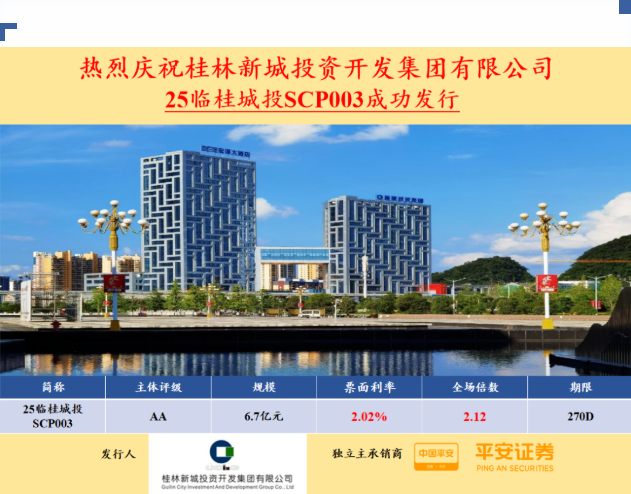 8月6日,桂林新城投資開發(fā)集團有限公司成功發(fā)行2025年度第三期超短期融資券,規(guī)模6.7億元,票面利率2.02%,認購倍數(shù)2.12倍,本期超短融由平安證券獨立承銷。此次成功發(fā)行超短融利率僅次于2025年度第二期超短融創(chuàng)下的“桂林市有史以來信用債發(fā)行的最低利率2.01%”!
