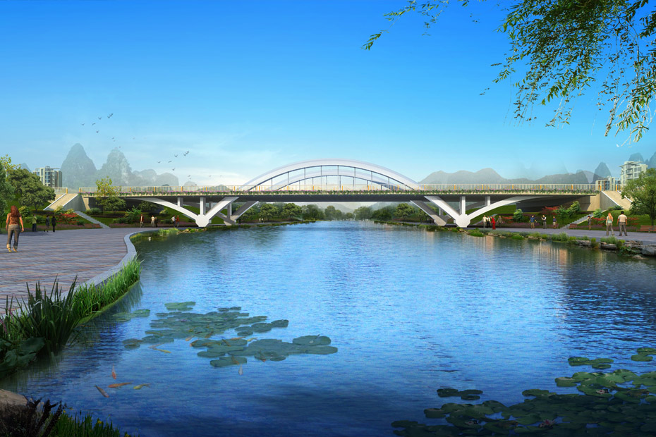 萬平橋位于萬平路與西城大道交叉口西側,橫跨中心環(huán)形河水域,是目前臨桂新區(qū)所有橋梁當中,投資最大、結構最復雜、施工難度最大的一座橋梁。橋梁設計為中承式飛燕拱橋,采用Y構鋼管混凝土拱橋組合體系,外觀新穎獨特,顏色鮮明亮麗,橋長123m,橋面寬度60m,全橋分左右兩幅,每幅橋在人行道及中央分隔帶處各設置拱肋,共設4道拱肋、28根吊桿。